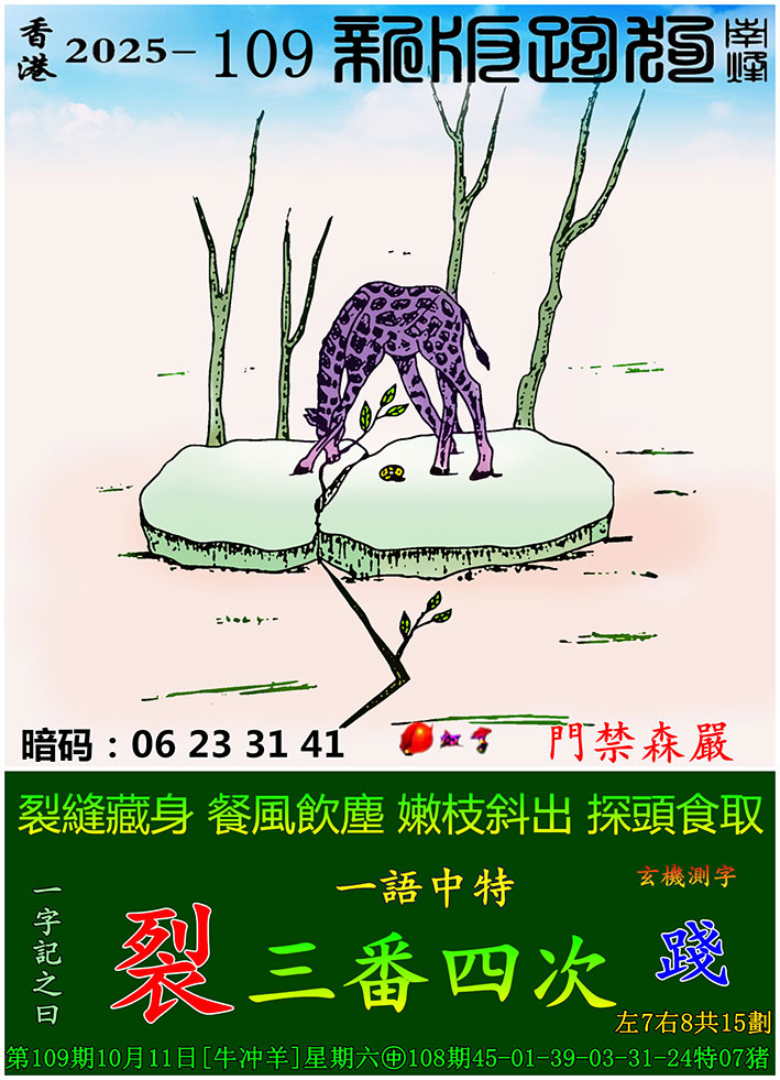 109期:新版跑狗一字記之曰【裂】 玄機測字:【踐】