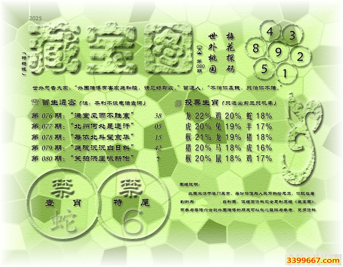 080期藏寶圖 新:真诚驭鹤乘鸾去 老:笑拍洪崖咏新作 禁:蛇 禁:6尾