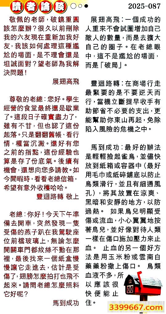 1.敬佩的老師,破鏡重圓該怎麼辦?很久以前刪除我的六友現在重新加我好友,我該如何處理這種尷尬的場面,是不理會還是坦誠面對?望老師為我解決問題!====展翅高飛