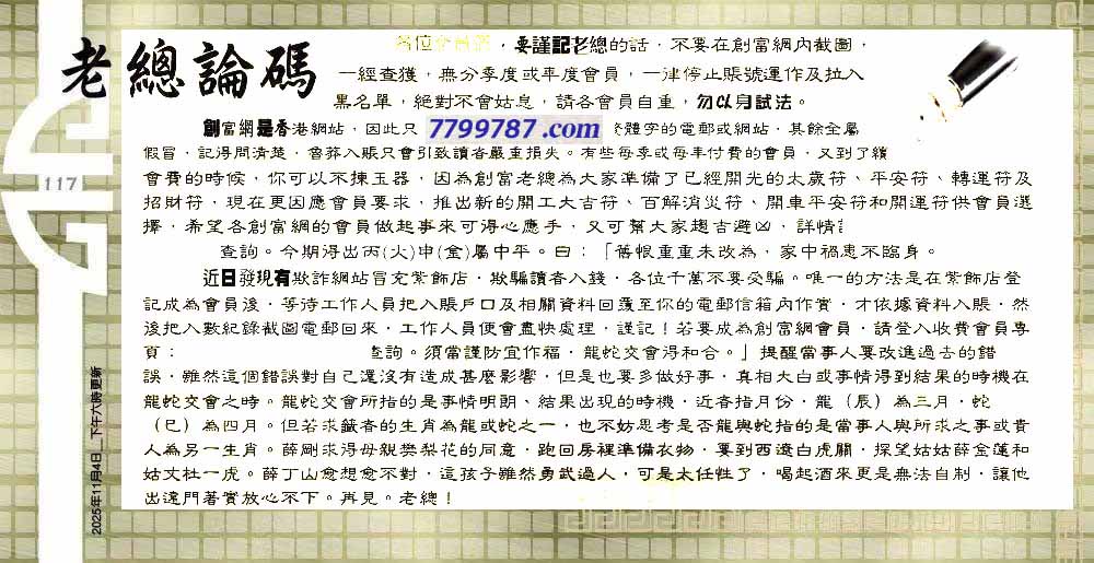 117期:六合皇金句/老总论码/萧公子/林大师/五行夺码/老总信箱截